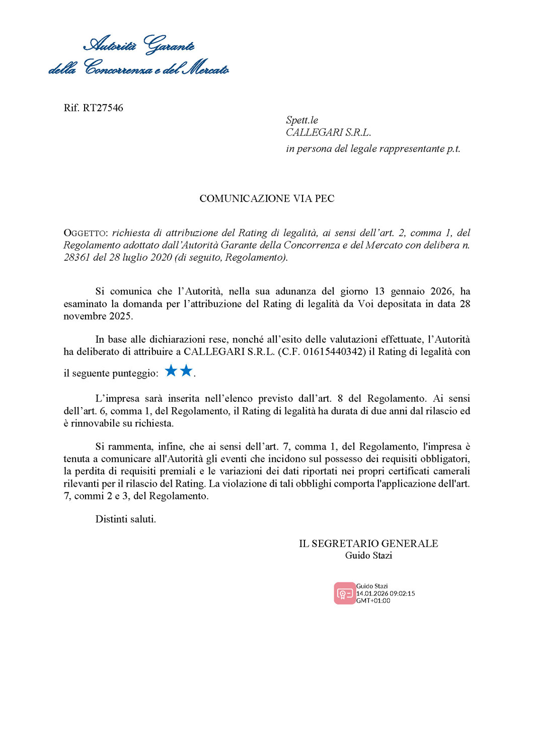 Callegari proudly announces the achievement of the Two-Star score in the Legality Rating, the prestigious award awarded by the Competition and Market Authority (AGCM).
